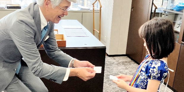 ファミリーデーとは、従業員の家族(小学生)を職場に招待し、社長との名刺交換や職場見学など、様々な体験ができるイベントを行っています。家族(子供)に仕事への理解を深めてもらうことや、従業員同士のコミュニティの輪を広げる機会にもなっています。